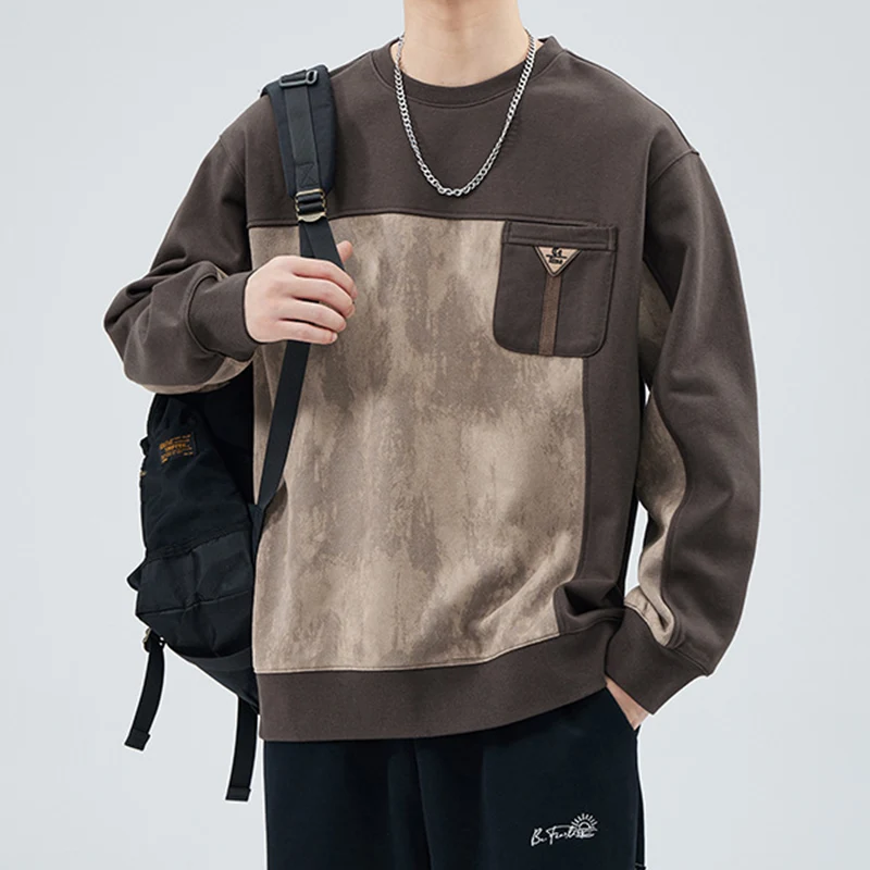 Men’s Color-Block Suede Sweatshirt Round Neck Top